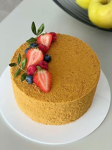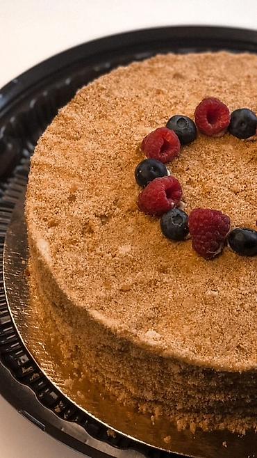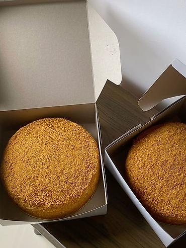 Торты в круглых пластиковых боксах с прозрачной крышкой. - Ассортимент: классические медовые торты, а также варианты с кремовыми и желейными украшениями, надписями и тематическим декором. Разные д...