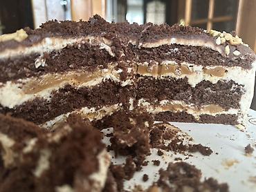 - Начинки на выбор: варёная сгущёнка, сливочно-сырный крем, шоколадный ганаш, ореховая крошка; возможны комбинированные слои (пример на фото: шоколадный бисквит с варёной сгущёнкой и крем-чизом).