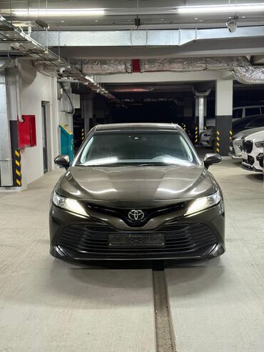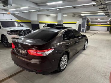 Toyota Camry, седан бизнес‑класса. Темно‑коричневый цвет кузова, светодиодная оптика спереди и сзади, хромированные элементы отделки. Панорамный люк/сдвижная крыша. Литые многоспицевые диски большого диаметра, тонированные стекла, парктроники сзади. Современный агрессивный дизайн передней части с широкой решеткой радиатора, задняя оптика с С‑образными светоэлементами. Один выхлоп справа.