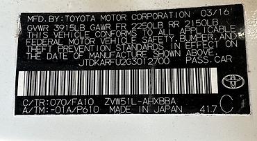 - VIN/кузов: JTDKARFU2G3012700 (указан в свидетельстве)