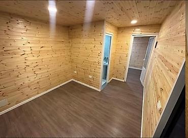 Работы включают каркасные и отделочные операции (на фото — пример внутренней отделки с деревянной вагонкой и встроенным освещением).