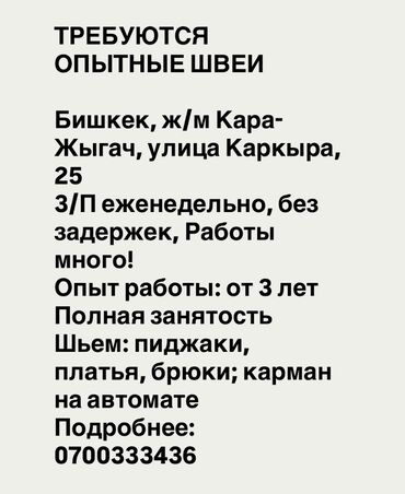 Тез арада опытный пятинитка тигуучулер керек аялдардын шымы тигилет ° цехте иштегенге бут шарттар бар. ° жумуш токтобойт, жыл бою айлыгы жума сайын берилет. - дарегибиз: Алыкулова /Ахунбаева...