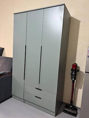 Шкаф-гардероб трёхдверный, современный дизайн в матовом серо-зелёном цвете с чёрными вертикальными ручками.