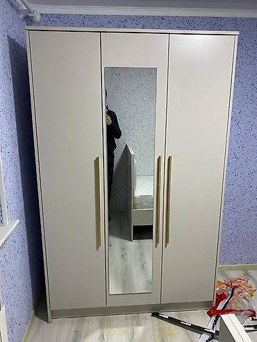 Трёхдверный шкаф-купе распашного типа с зеркалом по центру.