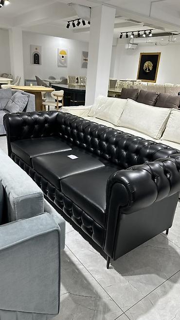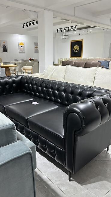 Диван в стиле Честерфилд, трехместный, обитый черной эко‑кожей. Классическая глубокая каретная стяжка по спинке и царге, скругленные подлокотники на одном уровне со спинкой, выраженный объемный капитоне по периметру. Сиденье из трех съемных подушек с прямой прострочкой. Устойчивые металлические опоры на высоких ножках создают легкий визуальный силуэт и облегчают уборку под диваном.
