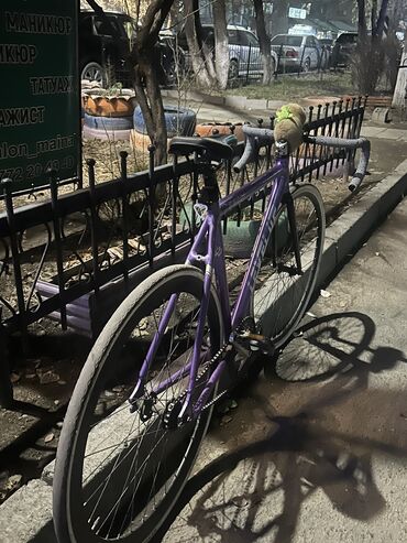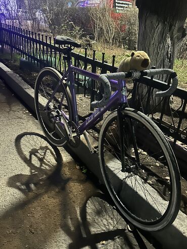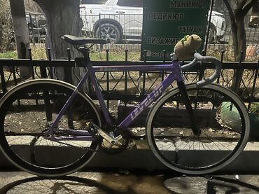 - Рама: алюминиевая, фиолетовая окраска, геометрия трек/фикс, жёсткая карбоновая (или алюминиевая) вилка под тормозное отверстие.