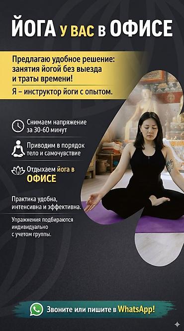 Выездной инструктор по йоге для офисов Йога прямо у вас в офисе — без потери времени на дорогу. Индивидуальный подбор упражнений с учетом состава группы. Подходит для малых групп и занятий на рабо...