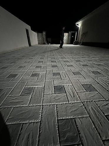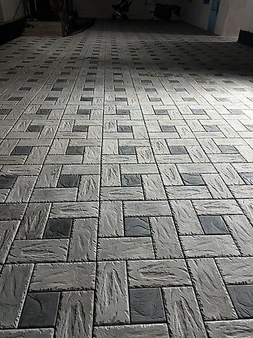 - Цвет и фактура: сочетание темно‑серых и светло‑серых (почти белых) плит со слегка «каменной» текстурой; визуально скрывает загрязнения и швы, выглядит одинаково аккуратно при дневном и ночном освещении.