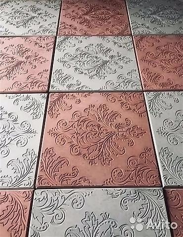 - Квадратная плитка с барочным/растительным рельефом: чередование цветов (серый и терракотовый), выразительный узор для декоративных площадок, садовых дорожек и патио.