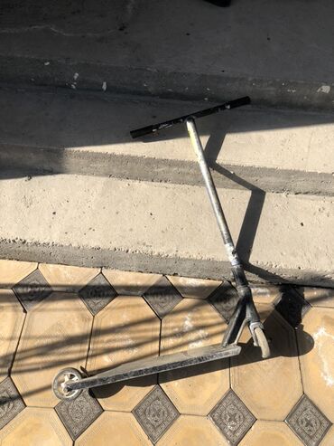 Трюковой самокат, классическая компоновка: - Прочная стальная Y‑руль без регулировки, с грипсами из резины. - Алюминиевая дека прямой формы с вырезом под колесо. - Колеса малого диаметра (примерно ...