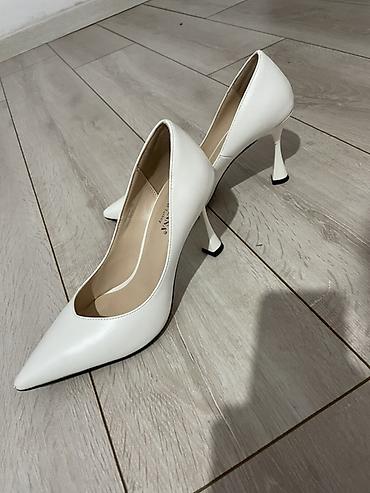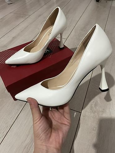 - Каблук оригинальной формы «рюмка»/«трапеция», металлизированный у серебристой пары и тон в тон у белой.