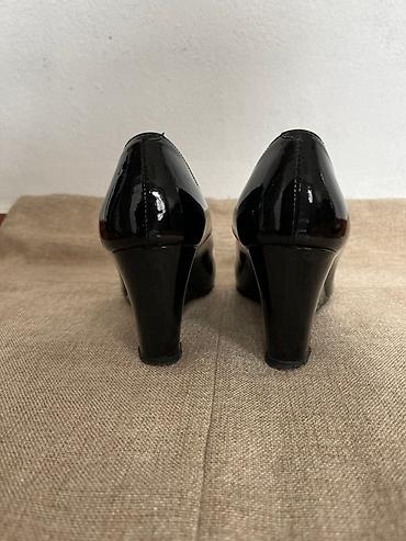 Элегантные женские туфли-лодочки на танкетке из черной лакированной кожи. Благодаря устойчивому каблуку-танкетке, они удобны для повседневной носки и подойдут как для офиса, так и для вечерних мероприятий. Классическая модель с закругленным носком.