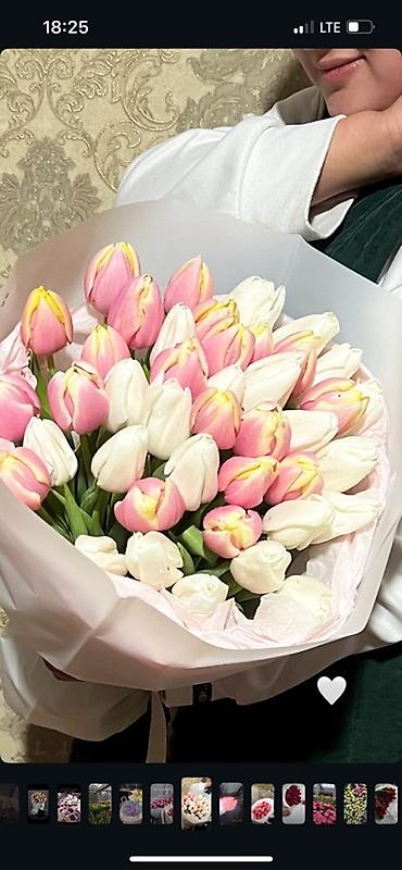 - Состав: свежесрезанные тюльпаны голландских и пионовидных сортов. На фото варианты: алые моно-букеты, двухцветные розово‑белые, нежно‑розовые с белым кантом, комбинированные бело‑розовые миксы, а также жёлтые.