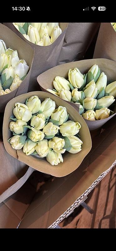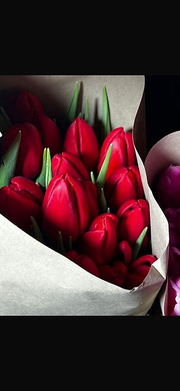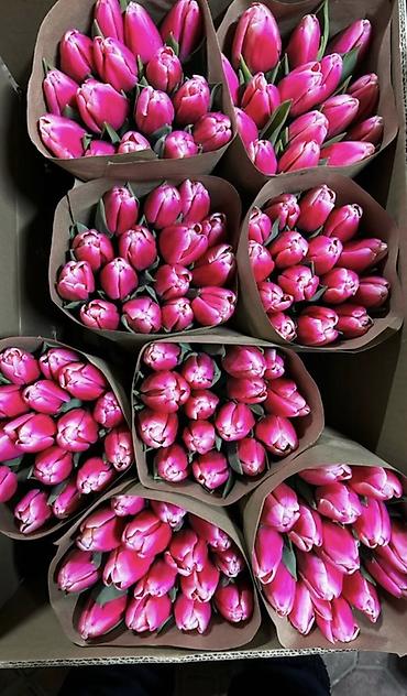 - Срезанные тюльпаны в букетах, плотные бутоны на крепких стеблях.