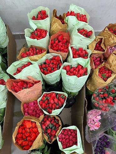 Крупные голландские тюльпаны, длина стебля 45–50 см. Доступны яркие однотонные оттенки: жёлтый, белый, розовый, фиолетовый (как на фото). Плотные бутоны, длинные ровные стебли, свежая зелень — отли...