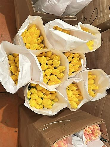 Тюльпаны срезанные, упакованные в бумажные конусы