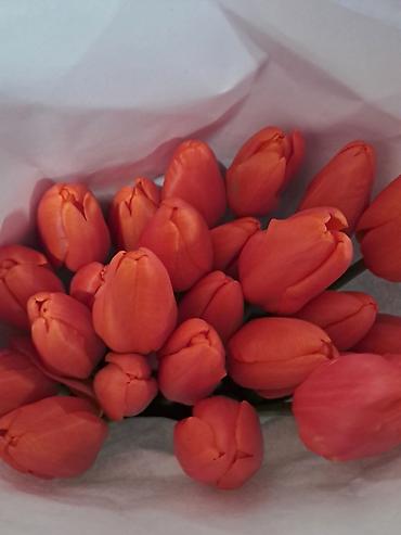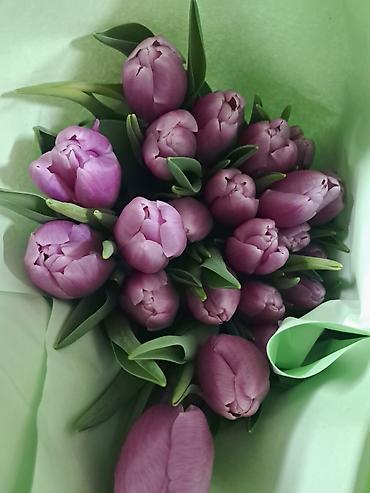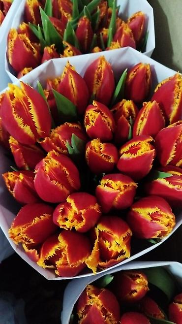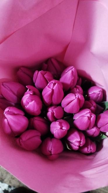 - Сформированные плотные букеты из свежесрезанных тюльпанов с сочной зеленью.