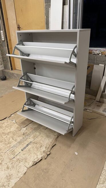Тумба для обуви с откидными дверцами, выполненная в светлом цвете. Модель оснащена тремя секциями для удобного хранения обуви. Откидные механизмы обеспечивают легкий доступ и компактное размещение ...