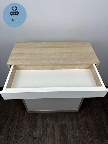 - Материалы: корпус под светлый дуб, фасады матовые белые. Устойчивая столешница для декора, ароматизаторов или подноса для ключей.