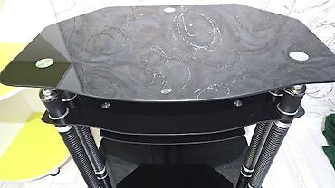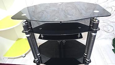 - 4 прочные полки: верхняя из тонированного закаленного стекла, нижние — из черного стекла/МДФ с глянцевым покрытием.