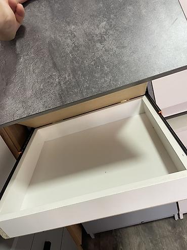 - Корпус и фасады в фактуре «бетон»; внутренние стенки ящиков белые.