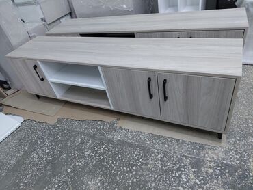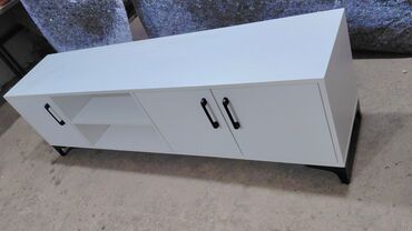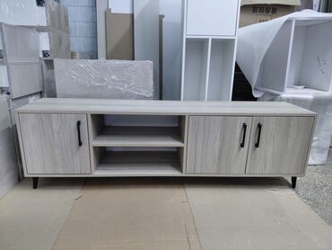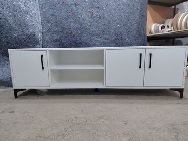 Тумба под ТВ/медиатумба современного дизайна. - Конфигурация: длинная прямоугольная тумба на высоких турецких конических ножках. - Корпус: светлый фасад с горизонтальной фрезеровкой/рифлением, бок...