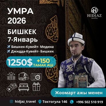 Умра 2025–2026 из Бишкека (декабрь) 🕋 14 күндүк Умра сапары. Ыйык сапар Макка, Мадина, Джидда да өтөт. Баардык шарттар каралган. Умра(кичи ажылык) 14-күндүк ыйык сапар Макка-Мадина-Джидда-Тоиф А...