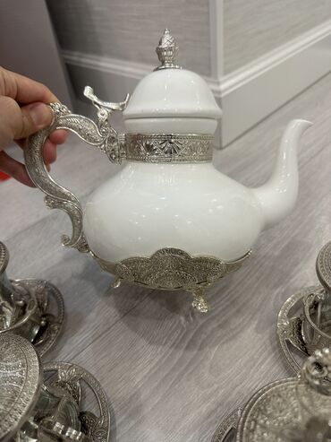 Платная доставкаСамовывозНабор для чаепития, состоящий из белого керамического чайника с серебристой отделкой и 5 стеклянных стаканов с подстаканниками, крышками и ложками, выполненных в серебристом стиле.