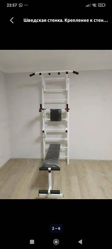 - Также на фото представлен вариант шведской стенки с турником и скамьей для пресса.