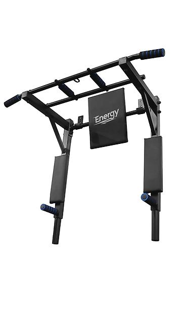 Настенный турник-брусья 3 в 1 Energy предназначен для выполнения различных упражнений на подтягивание, отжимание и пресс. Конструкция белого цвета с мягкими накладками синего цвета на ручках и упорах. Подходит для использования дома или в спортивном зале, позволяя эффективно тренировать мышцы верхней части тела.
