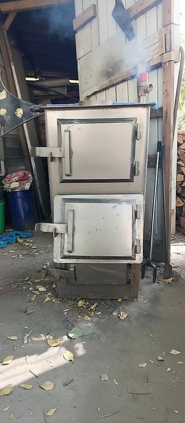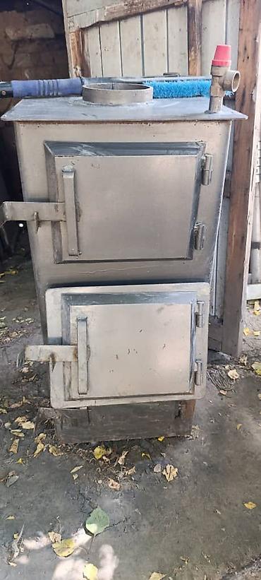 Подходит для отопления частного дома, мастерской, гаража, теплицы. Возможна работа как самостоятельная печь или как котёл в водяной системе отопления (есть выходы/патрубки). Диаметр дымоходного выхода и габариты ориентировочно: дымоход ~120–130 мм; высота около 90–110 см, ширина ~45–55 см, глубина ~50–60 см (по фото).