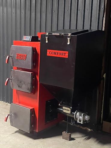 Твердотопливный котел Thermo Gradus с автоматической подачей топлива Comfort. Котел выполнен в красно-черной цветовой гамме и оснащен тремя дверцами для удобства обслуживания. Установлен контроллер для управления режимами работы. Бункер для топлива Comfort обеспечивает длительное автономное горение. Подходит для отопления частных домов и небольших производственных помещений.