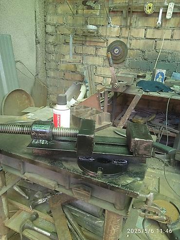Слесарные тиски на металлическом столе/тумбе. Описание: - Массивные слесарные тиски с узкими насечёнными губками, ручной привод винтовой рукояткой. - Крепление тисков к столешнице болтами через оп...