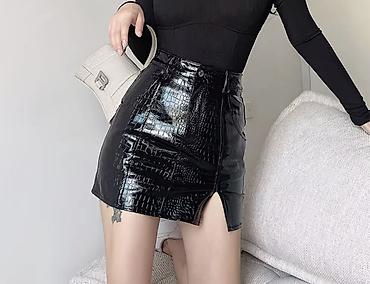 Юбка мини из чёрной экокожи с молниями - Материал: плотная экокожа с лёгким матовым блеском. - Крой: прямой, мини-длина. - Детали: декоративные и функциональные молнии спереди — горизонтальная по ...