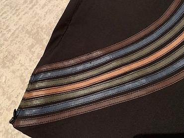 Юбка женская, прямого кроя, длина — около колена. Цвет — глубокий чёрный с декоративными акцентами: по нижнему краю широкая бордовая полоса с геометрическим (сотовым) узором и несколько вертикальны...