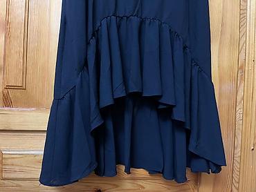 - Крой: асимметричный низ, многослойные рюши/воланы спереди и по бокам, легкое расклешение