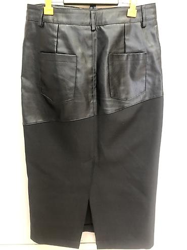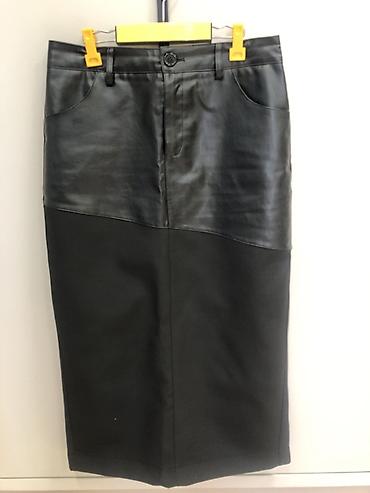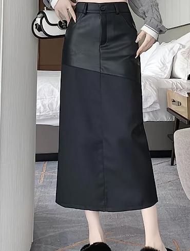 Юбка миди с комбинированной фактурой: верхняя часть выполнена из чёрной экокожи, нижняя — из плотной костюмной ткани. Ассиметричная линия соединения материалов визуально вытягивает силуэт. Прямой крой, высокая посадка, длина до щиколотки/середины икры.