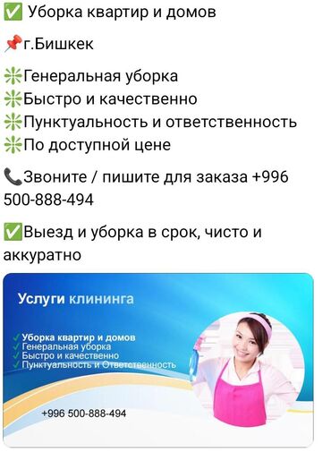Клининг.Убираем дома,квартиры,офисы,кафе,магазины.Делаем:генеральную,влажную,после ремонта,после квартирантов уборку.Моем окна.Гарантируем чистоту и порядок.Делаем все качественно.Используем свои с...