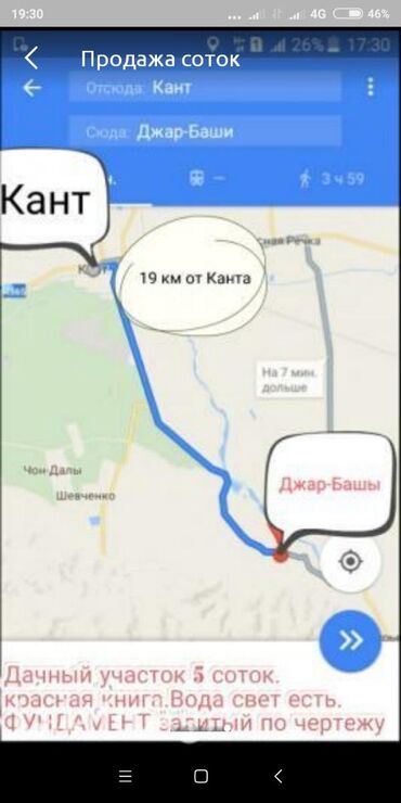 Продается ДАЧНЫЙ участок для стрительсва! Без посредников! Красная книга имеется! 5 соток. Участок находится в районе Джар-Баши, 19 км от Канта вверх ! Имеется питьевая вода, электричество, и фундамент, залитый по чертежу. Свежий чистый воздух. Рядом есть школа, и не большое озеро для отдыха Могу видео на вотсап скинуть если интересно. цена окончательная! Наличкой не пугать!!!! На обмен дороже ! 12 500. Есть вариант обмен на авто только на газе или гибрид !!!! Пишите звоните на вотсап.