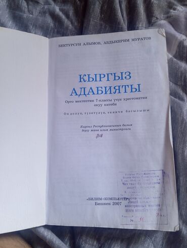 Книга «Кыргыз Адабияты» — это учебное пособие по кыргызской литературе, предназначенное для учащихся 7-х классов общеобразовательных школ. Учебник содержит хрестоматийные материалы и разработан для изучения предмета в соответствии с образовательной программой. Яркая обложка синего цвета с изображением гор и надписью «7» указывает на класс, для которого предназначено издание. Внутри указаны авторы и год издания — 2007, а также наличие штампа библиотеки.