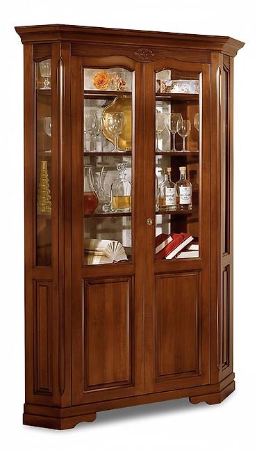 Угловая двух дверная витрина, Италия - Размер 90 см x 90 см x 205 см выполнена в стиле неоклассицизма из массива дерева. Остекленные дверцы витрины запираются на ключ, за ней расположены полки, по бокам витрины - стеклянные вставки. Верх витрины декорирован поперечными желобками и выпуклой резьбой в форме овальной розетки-цветка. Замочная скважина и ключик покрыты позолотой.