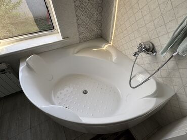 Угловая акриловая ванна. - Форма: треугольная/сектор круга, правая установка (скруглённый фасад). - Материал: белый глянцевый акрил. - Конструкция чаши: эргономичная спинка с подголовной зоной; ра...