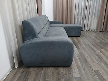 Угловой диван с оттоманкой, обит мягкой велюровой тканью серого цвета. Современная, лаконичная форма с широкими подлокотниками и глубокими сиденьями. Комплектация: - три большие спинки-подушки и дв...