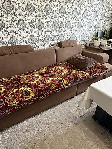 Угловой диван-кровать, тканевая обивка бежево-коричневого цвета.