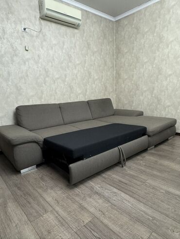 Угловой диван с секционным дизайном и функцией трансформации в кровать. Обивка выполнена из плотной ткани серого цвета, что обеспечивает практичность и долговечность. Модель оснащена широкими подлокотниками и металлическими ножками. Легко раскладывается, предоставляя дополнительное спальное место. Подходит для различных интерьеров и может быть использован как в гостиной, так и в спальне.