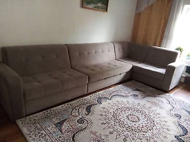 Угловой диван-трансформер, тканевая обивка бежевого/таупового цвета.