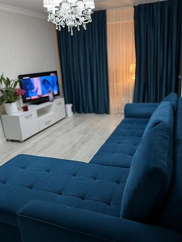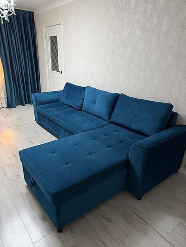 Угловой диван-трансформер, обитый велюром глубокого синего цвета.