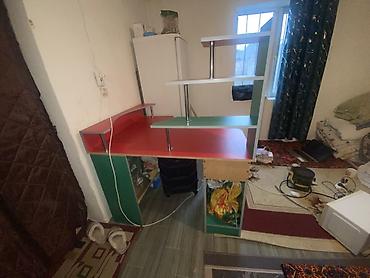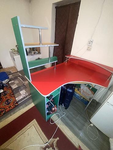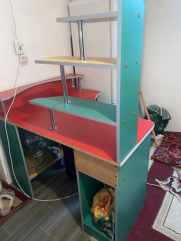 - Цветовое оформление: красная столешница, зелёные боковины, полки светлых тонов с серой окантовкой — яркий акцент для детской, кабинета или рабочего уголка.