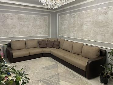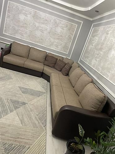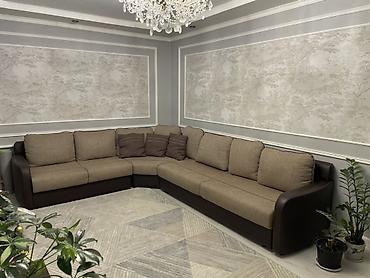 - Обивка: комбинированная — сиденья и спинки из плотной износостойкой ткани теплого бежевого оттенка; боковины и цоколь — экокожа темно‑коричневого цвета. Контраст подчеркивает форму и легко вписывается в современный интерьер.