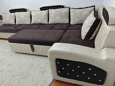 - Обивка: комбинированная. Корпус в светлом бежевом тоне с легким перламутровым рисунком; сиденья и вставки — темно‑шоколадная ткань. Подушки — бежевые с крупным жаккардовым орнаментом, кант в темном цвете.